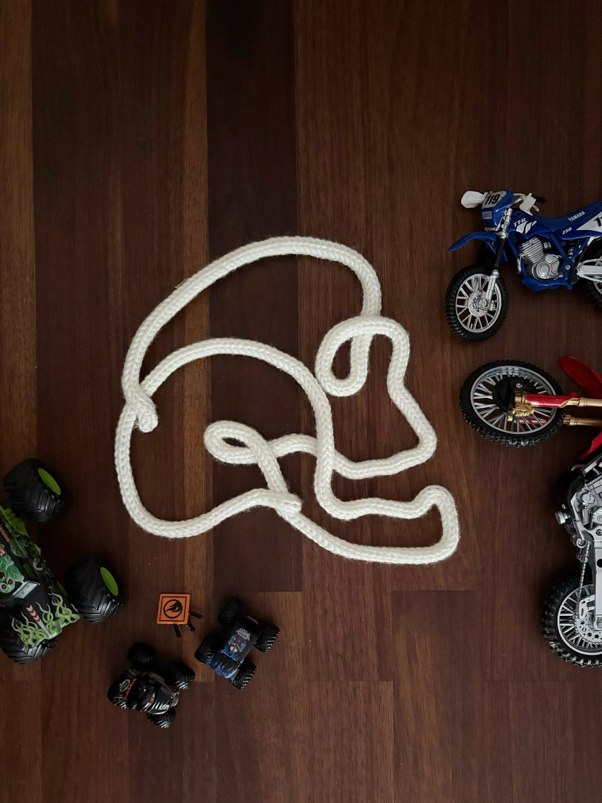 🧶 Création est fabriquée avec un fil d’acier bien solide (mais discret) et une douce corde de laine — juste du beau et du sécuritaire. Chaque corde laine est tissé à la main (oui!).